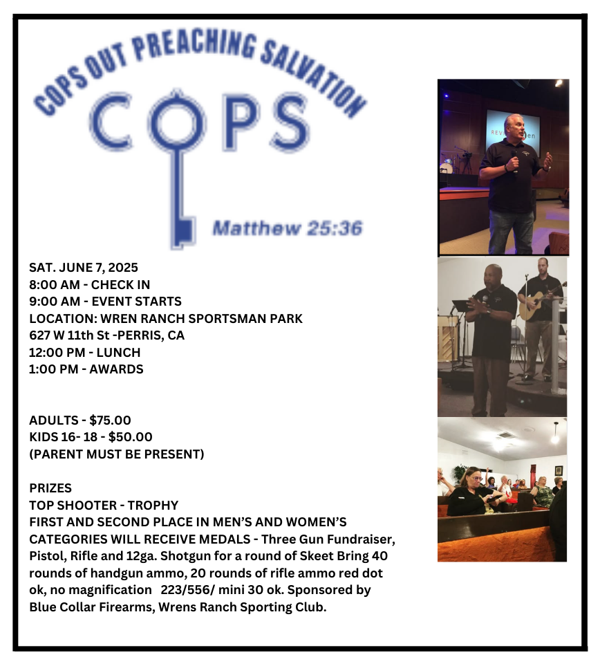 June 7 @ 8:00 AM - 3:00 PM COPS at Wren Ranch Sportsman Park – Three Gun Fundraiser Wren Ranch Sportsman Park 627 W 11th St., Perris COPS at Wren Ranch Sportsman Park - Three Gun Fundraiser ...